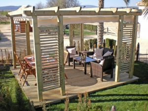 La pérgola Itálica de madera maciza de pino silvestre y 420 x 420 cm tiene una estructura muy similar a la Pérgola Hispalis pero cambia los pilares dobles con celosías por celosías con elementos paralelos. Esto le da un aspecto muy sofisticado y elegante. Sus amplias dimensiones nos permiten crear dos ambientes distintos dentro de la pérgola, aprovechando al máximo todo el espacio. Puedes adquirirla por 1.166,86€ + iva en Pérgola Itálica. |